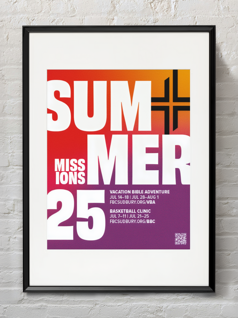 Every summer FBC Sudbury hosts a number of children’s free summer activities as an outreach to the community. My goal was to create a poster that could encompass the fun and exciting energy of summer while catching the eye of parents as they walk by. I ended up using bold colors inspired by the principal art for the churches Vacation Bible Adventure camp, with a splash or orange to represent the Basketball Clinic as well.